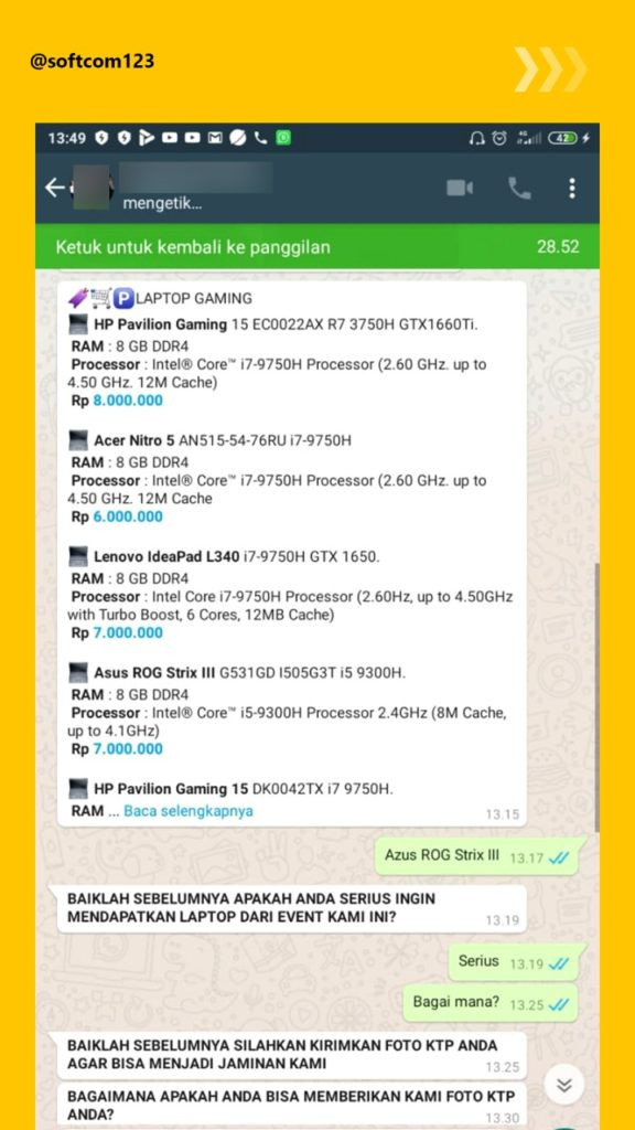 Contoh kasus penipuan belanja online atas nama Softcom: