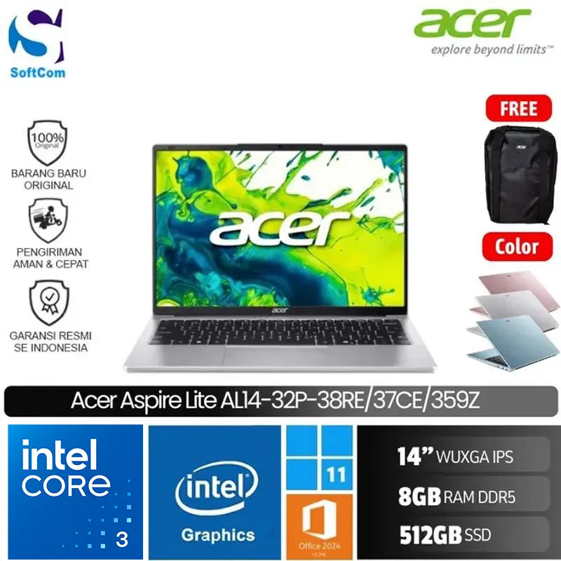 ![Acer Aspire Lite AL14 32P 37CE 38RE 359Z /Intel Core 3 N355/8GB/512GB SSD/14" WUXGA IPS/Win 11 Home+OHM 2024+M365 [ AL14-32P-37CE | AL14-32P-38RE | AL14-32P-359Z ]](https://www.softcom.co.id/wp-content/uploads/2025/05/Al14-32p-38.webp)