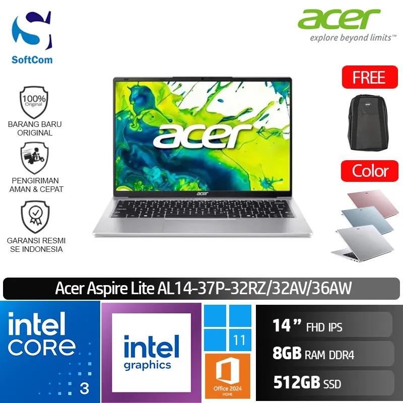 ![Acer Aspire Lite AL14 37P 32RZ 32AV 36AW /Intel Core 3-N355/8GB/512GB SSD/14" FHD IPS/Win 11 Home+OHM 2024+M365 [ AL14-37P-32RZ | AL14-37P-32AV | AL14-37P-36AW ] - Image 6](https://www.softcom.co.id/wp-content/uploads/2025/08/bb.jpeg)