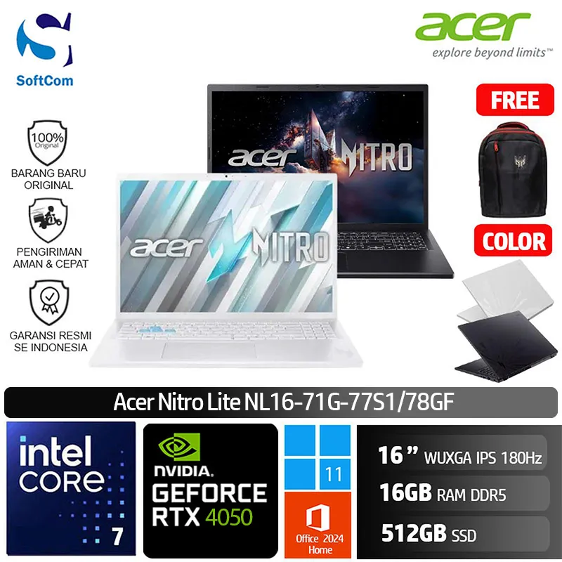 ![Acer Nitro Lite NL16-71G-77S1 78GF/Intel Core 7 240H/16GB/512GB SSD/GeForce RTX 4050 6GB/16" WUXGA 180Hz/Win 11 Home+OHM 2024+M365 [ NL16-71G-77S1 | NL16-71G-78GF ]](https://www.softcom.co.id/wp-content/uploads/2025/09/Acer-Nitro-Lite-NL16-71G-77S1-78GF.webp)