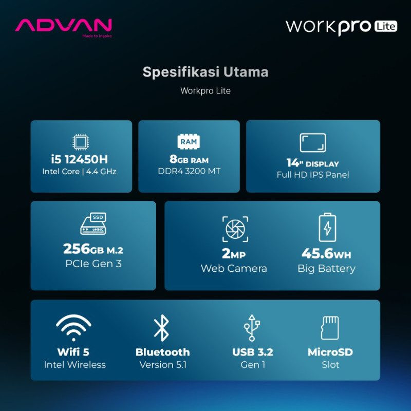 Advan Workpro Lite i5 12450H/8GB/256GB SSD/14″ Inch FHD IPS/Windows 11 Home