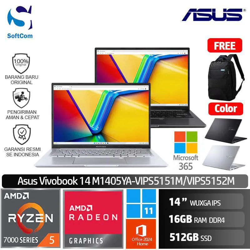 ![Asus Vivobook 14 M1405YA VIPS5151M VIPS5152M/Ryzen 5-7430U/16GB/512GB SSD/14" WUXGA/Win 11 Home + OHM 2024 + M365 [M1405YA-VIPS5151M | M1405YA-VIPS5152M] - Image 4](https://www.softcom.co.id/wp-content/uploads/2025/05/329c732b-c5be-4484-95b9-3d83a44d65a9.jpg)