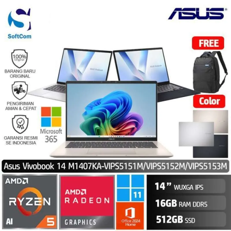 Asus Vivobook 14 M1407KA VIPS5154M VIPS5155M VIPS5156M/Ryzen AI 5 340/16GB/512GB SSD/14″ WUXGA/Win 11 Home+OHM 2024+M365