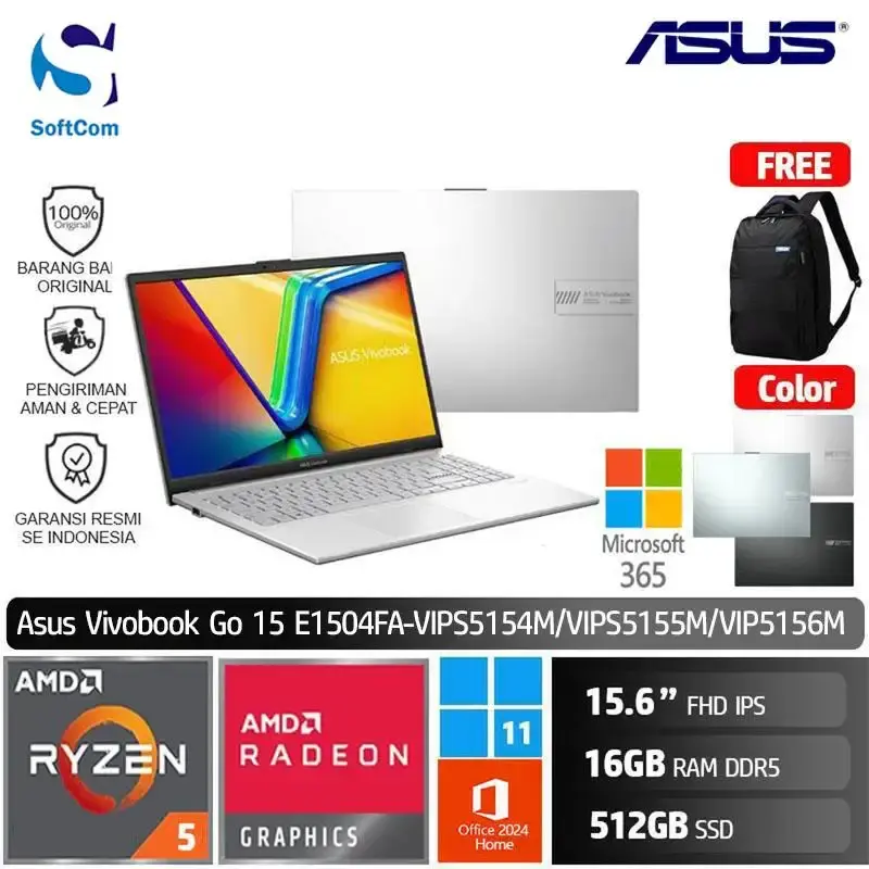 ![Asus Vivobook Go 15 E1504FA VIPS5154M VIPS5155M VIPS5156M/Ryzen 5-40/16GB/512GB SSD/15.6" FHD/Win 11 Home+OHM 2024+M365 [E1504FA-VIPS5154M | E1504FA-VIPS5155M | E1504FA-VIPS5156M] - Image 5](https://www.softcom.co.id/wp-content/uploads/2025/03/4-10.jpg)