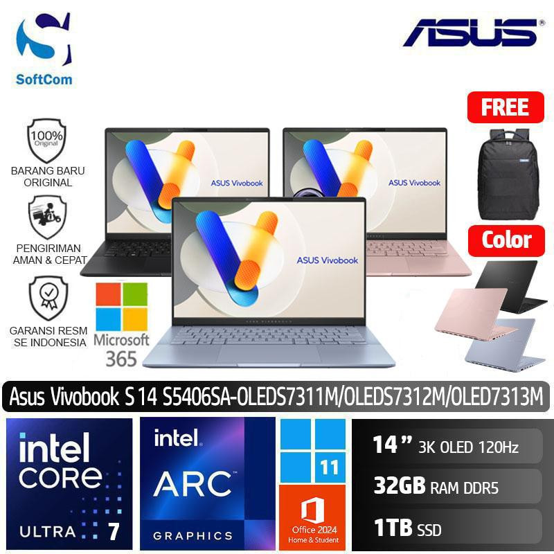 ![Asus Vivobook S14 S5406SA OLEDS7311M OLEDS713M OLEDS7312M/Ultra 7 258V/32GB/1TB SSD/14" 3K OLED/Win 11 Home+OHM 2024+M365/ [S5406SA-OLEDS7311M | S5406SA-OLEDS7312M | S5406SA-OLEDS7313M] - Image 3](https://www.softcom.co.id/wp-content/uploads/2025/01/2-58.jpg)