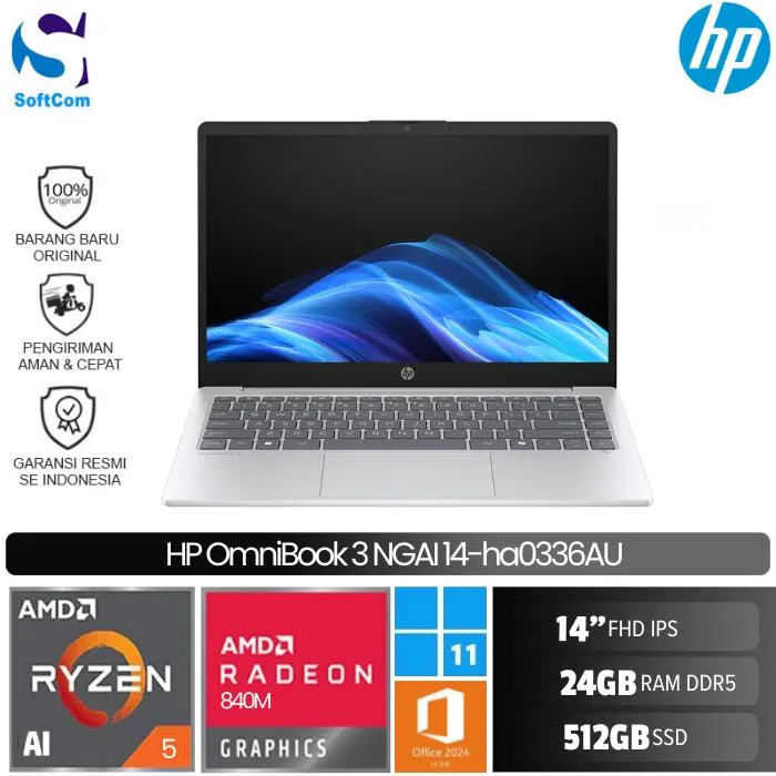 HP OmniBook 3 Next Gen AI 14-ha0336AU/Ryzen AI 5-340/24GB/512 GB SSD/14″FHD/Win 11 Home+OHS 2024/Silver
