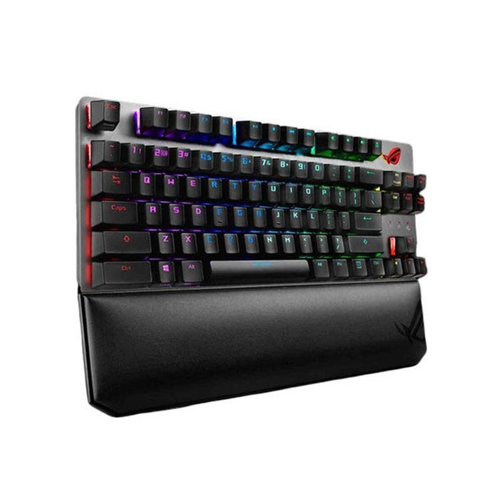 ROG Strix Scope TKL Deluxe wired mechanical RGB gaming keyboard for FPS games, with Cherry MX switches, aluminum frame, ergonomic wrist rest, and Aura Sync lighting