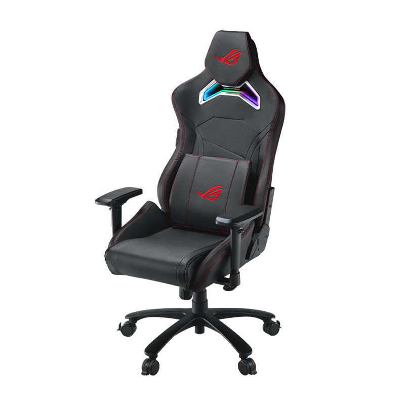 ROG Chariot RGB gaming chair in racing car style featuring memory foam lumbar support, 4D armrests, tilt mechanism and durable class 4 gas lift