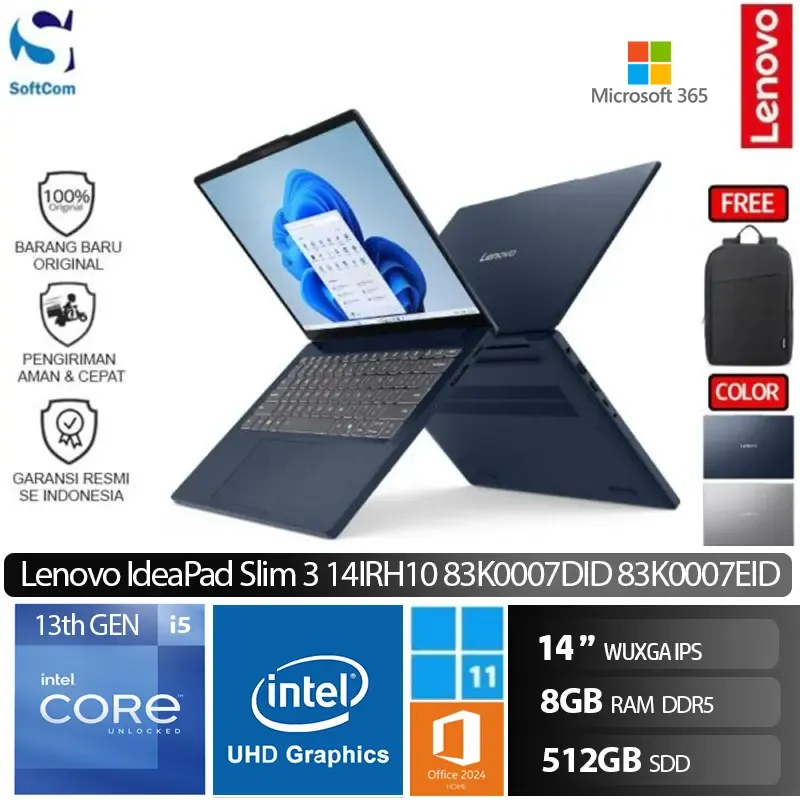 ![Lenovo IdeaPad Slim 3 14IRH10 7DID 7EID /Intel Core i5-13420H/8GB/512GB SSD/14" WUXGA IPS/Win 11 Home + OHM 2024/ [83K0007DID| 83K0007EID] - Image 4](https://www.softcom.co.id/wp-content/uploads/2025/04/2-11.jpg)