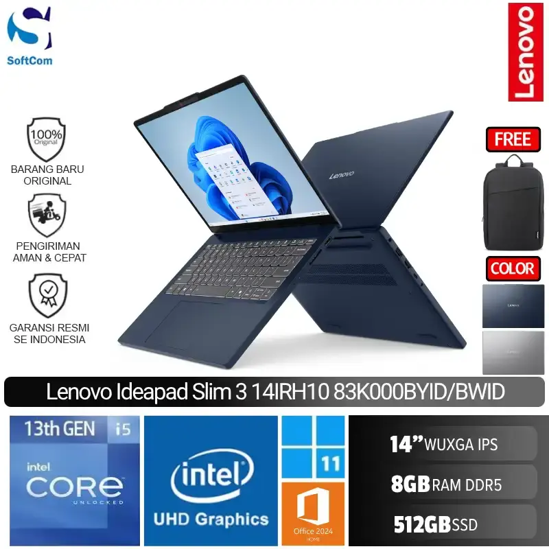 ![Lenovo IdeaPad Slim 3 14IRH10 BYID BWID/Intel Core i5-13420H/8GB/512GB SSD/14″WUXGA/Win 11 Home + OHM 2024 + M365 [83K000BYID | 83K000BWID] - Image 2](https://www.softcom.co.id/wp-content/uploads/2025/10/br-m036969-01898_lenovo-ip3-slim-3-14irh10-byid-bwid-i5-13420h-16gb-512gb-ssd-14-wuxga-w11_full06-4c109d94.webp)