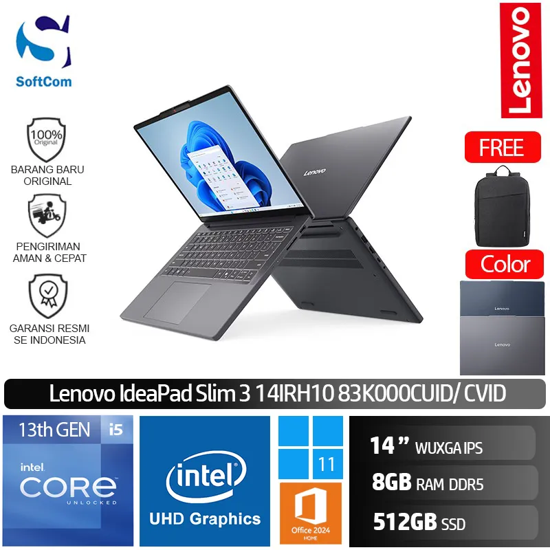 ![Lenovo IdeaPad Slim 3 14IRH10 CUID CVID/Intel Core i5-13420H/8GB/512GB SSD/14″ WUXGA IPS/Win 11 Home+OHM 2024+M365 [83K000CUID | 83K000CVID] - Image 3](https://www.softcom.co.id/wp-content/uploads/2025/10/br-m036969-01898_lenovo-ip3-slim-3-14irh10-byid-bwid-i5-13420h-16gb-512gb-ssd-14-wuxga-w11_full05-b03e7170.webp)