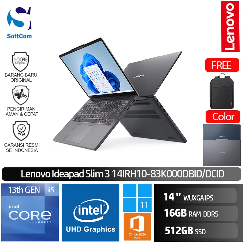![Lenovo IdeaPad Slim 3 14IRH10 DBID DCID/Intel Core i5-13420H/16GB/512GB SSD/14″ WUXGA IPS/Win 11 Home+OHM 2024+M365 [83K000DBID | 83K000DCID] - Image 6](https://www.softcom.co.id/wp-content/uploads/2025/10/br-m036969-01898_lenovo-ip3-slim-3-14irh10-byid-bwid-i5-13420h-16gb-512gb-ssd-14-wuxga-w11_full02-4edcddaa.webp)