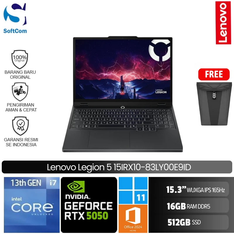 Lenovo Legion 5 15IRX10 83LY00E9ID/Intel Core i7 13650HX/16GB/512GB SSD/GeForce RTX 5050 8GB/15.3″WUXGA 165Hz/Win 11 Home +OHM 2024 + M365/Eclipse Black
