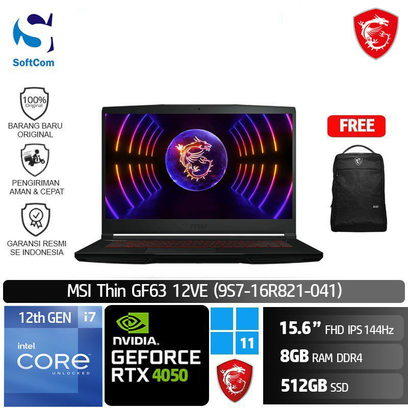 MSI Thin GF63 12VE (9S7-16R821-041) /Core i7-12650H/8GB/512GB SSD/GeForce RTX 4050 6GB/15.6″ FHD IPS/Win 11 Home/Black