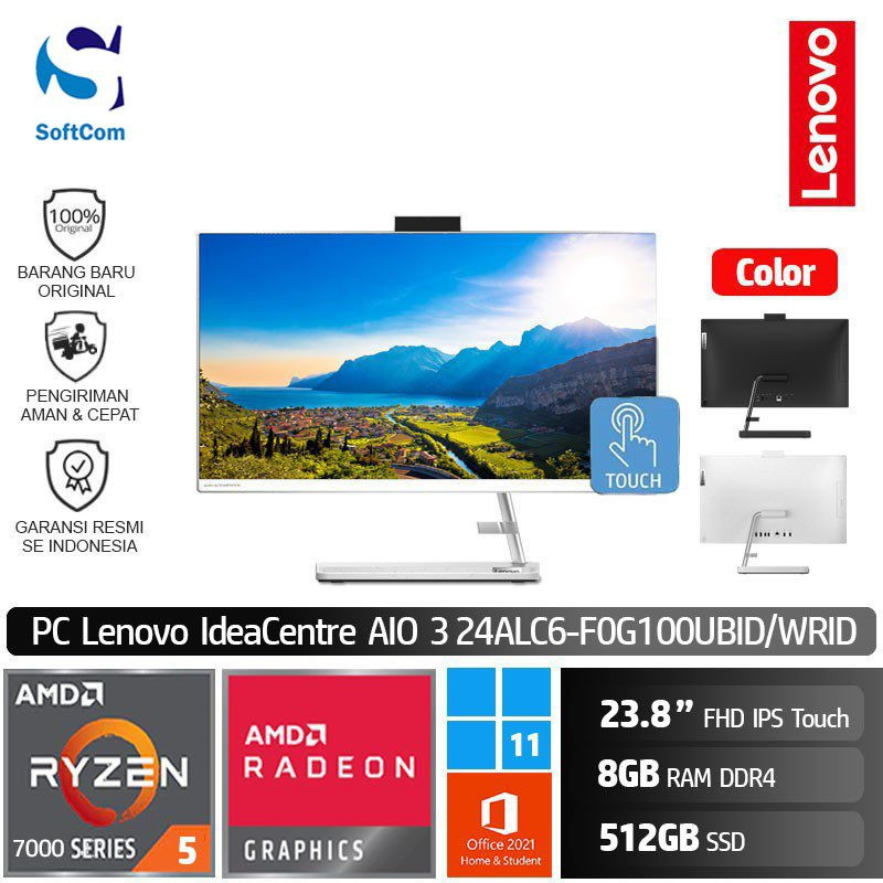 ![PC Lenovo IdeaCentre AIO 3 24ALC6 UBID WRID/AMD Ryzen 5-7530U/8GB/512GB SSD/23.8" FHD Touch/Win 11 Home+OHS 2021 [F0G100UBID | F0G100WRID] - Image 2](https://www.softcom.co.id/wp-content/uploads/2023/12/1-6.jpg)